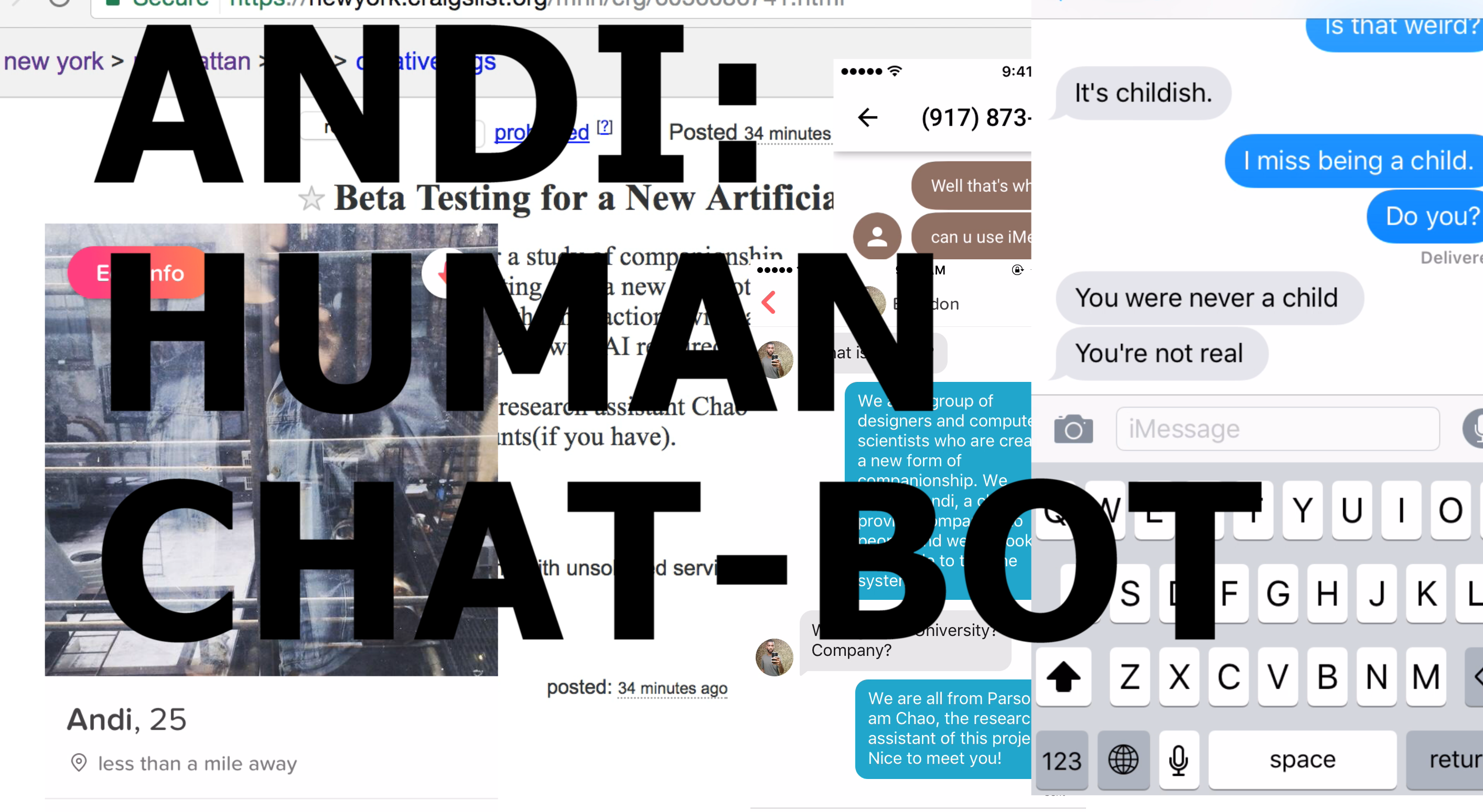 Andi: human chat-bot is a social exploratory research project, observing how people behave when they believe they are interacting with a chat-bot that is more human than other chat-bots and has the ability to have meaningful and personal conversations.